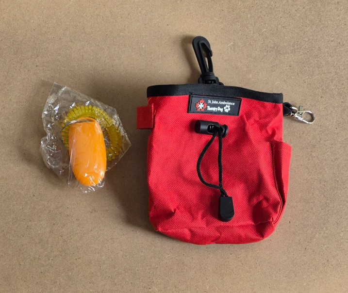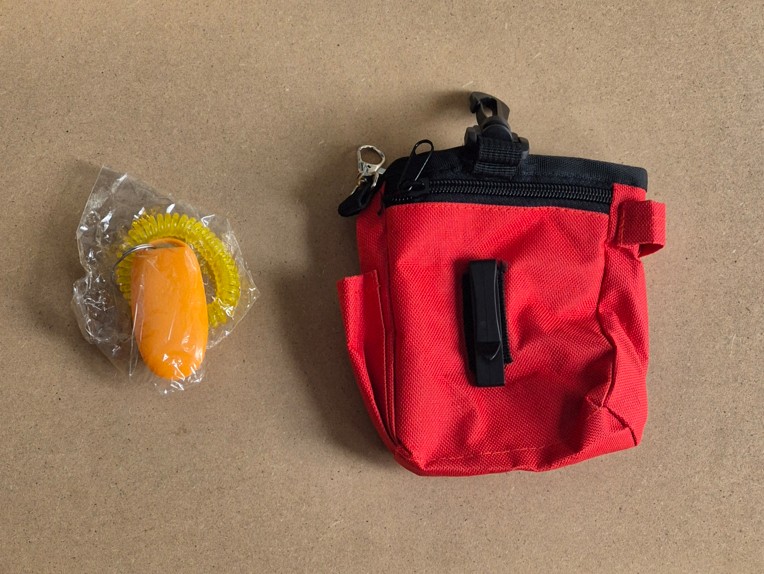 Great quality , lots of clips and pockets . Not too big to clip onto a belt while visiting or walking . This bag includes a clicker for training