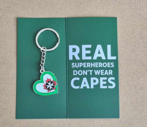 a great quality keychain with the logo encompassed inside a heart in a nice quality card for Volunteer Appreciation .