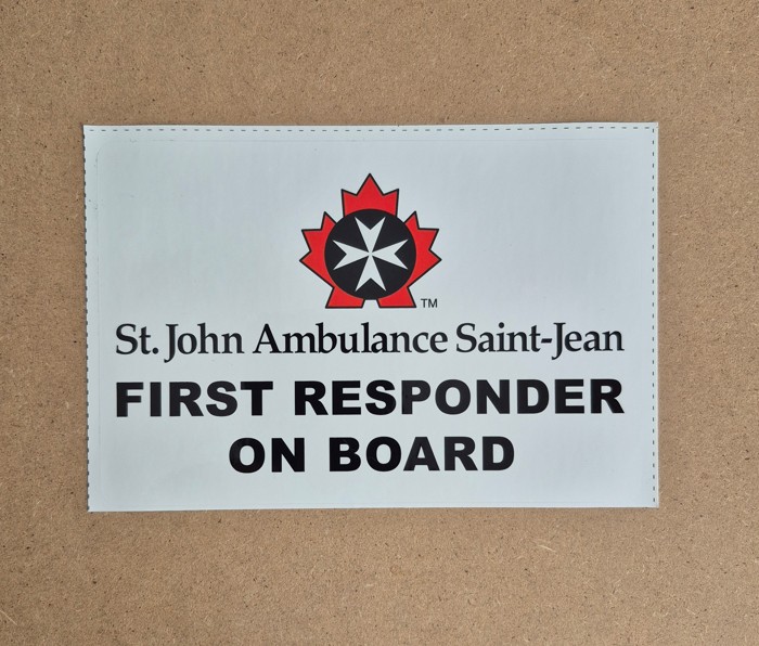 Vinyl , durable for outdoor use . Let it be known you are a qualified first responder !